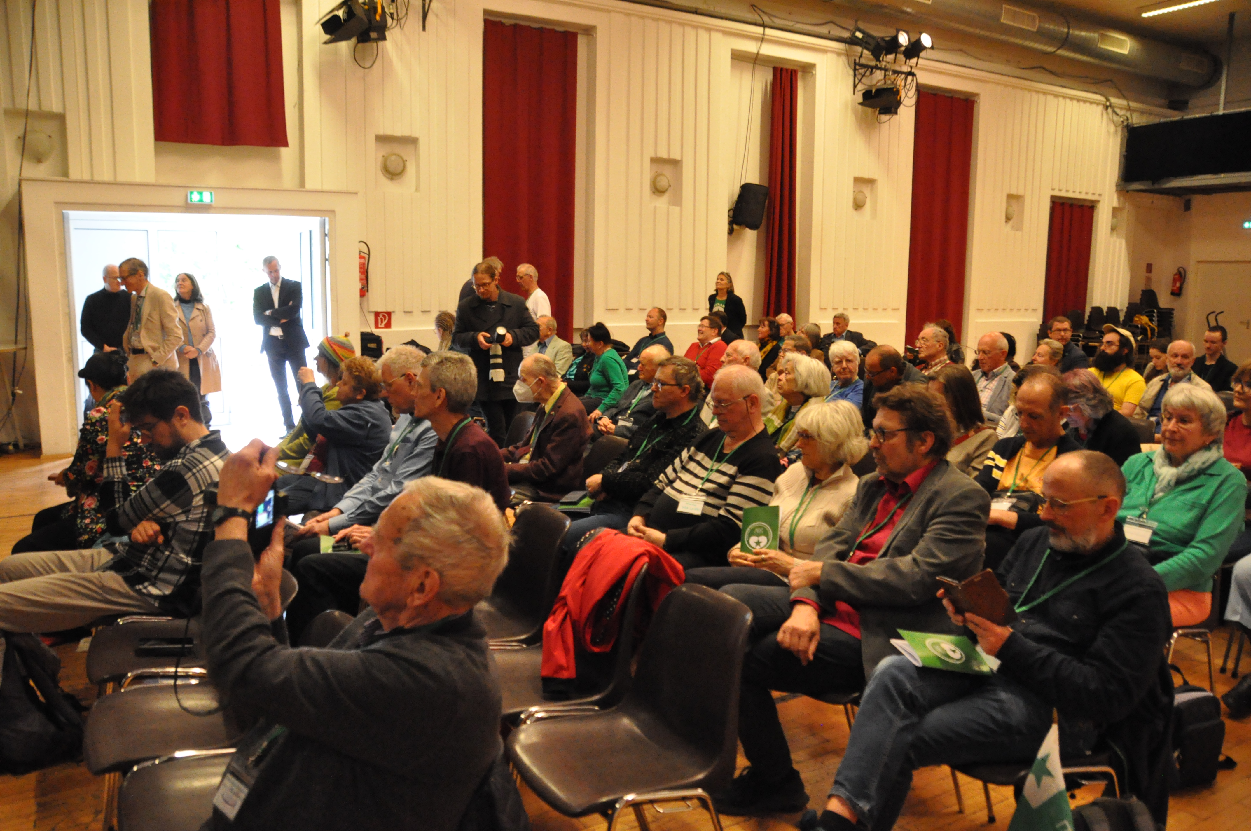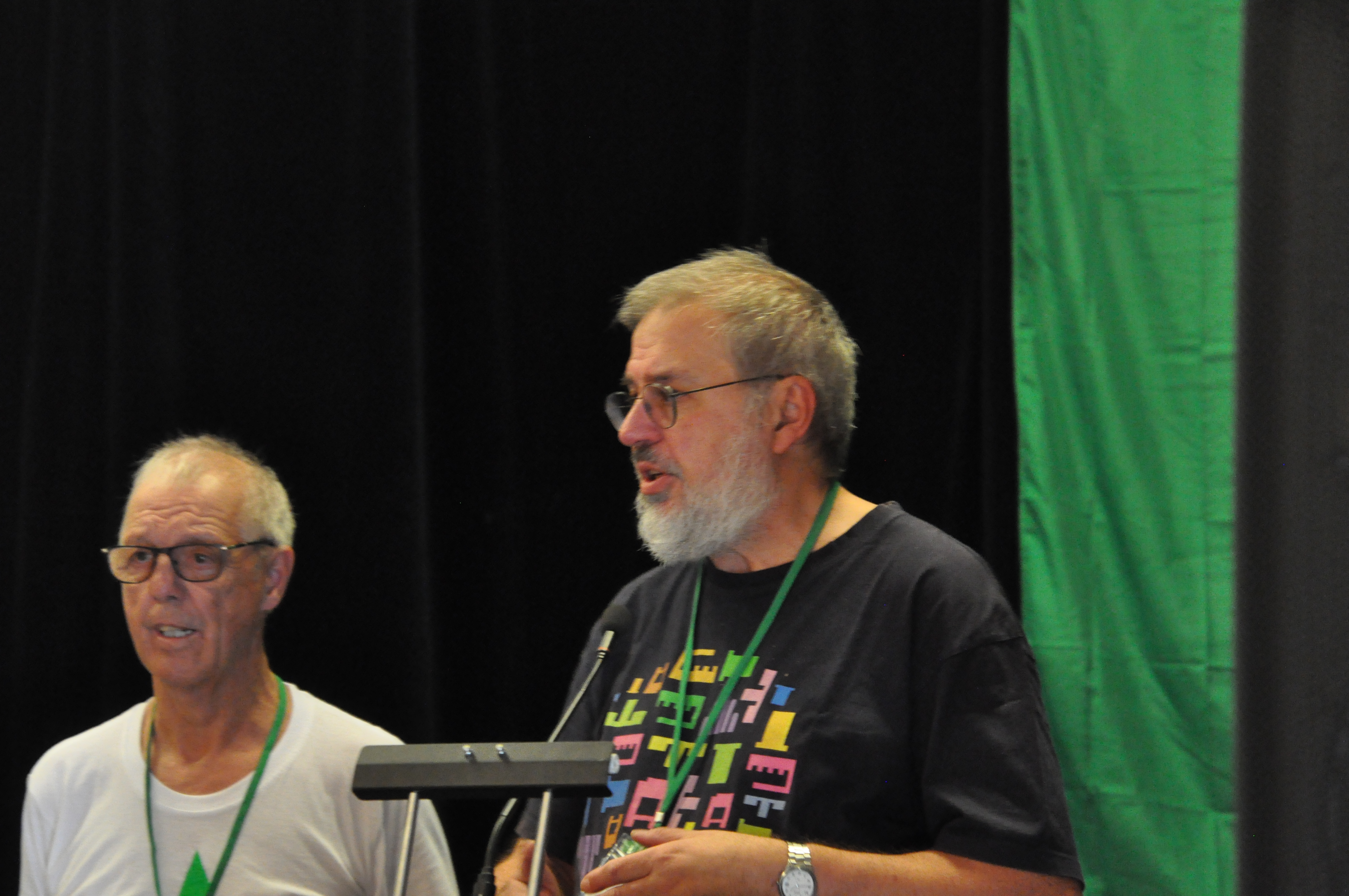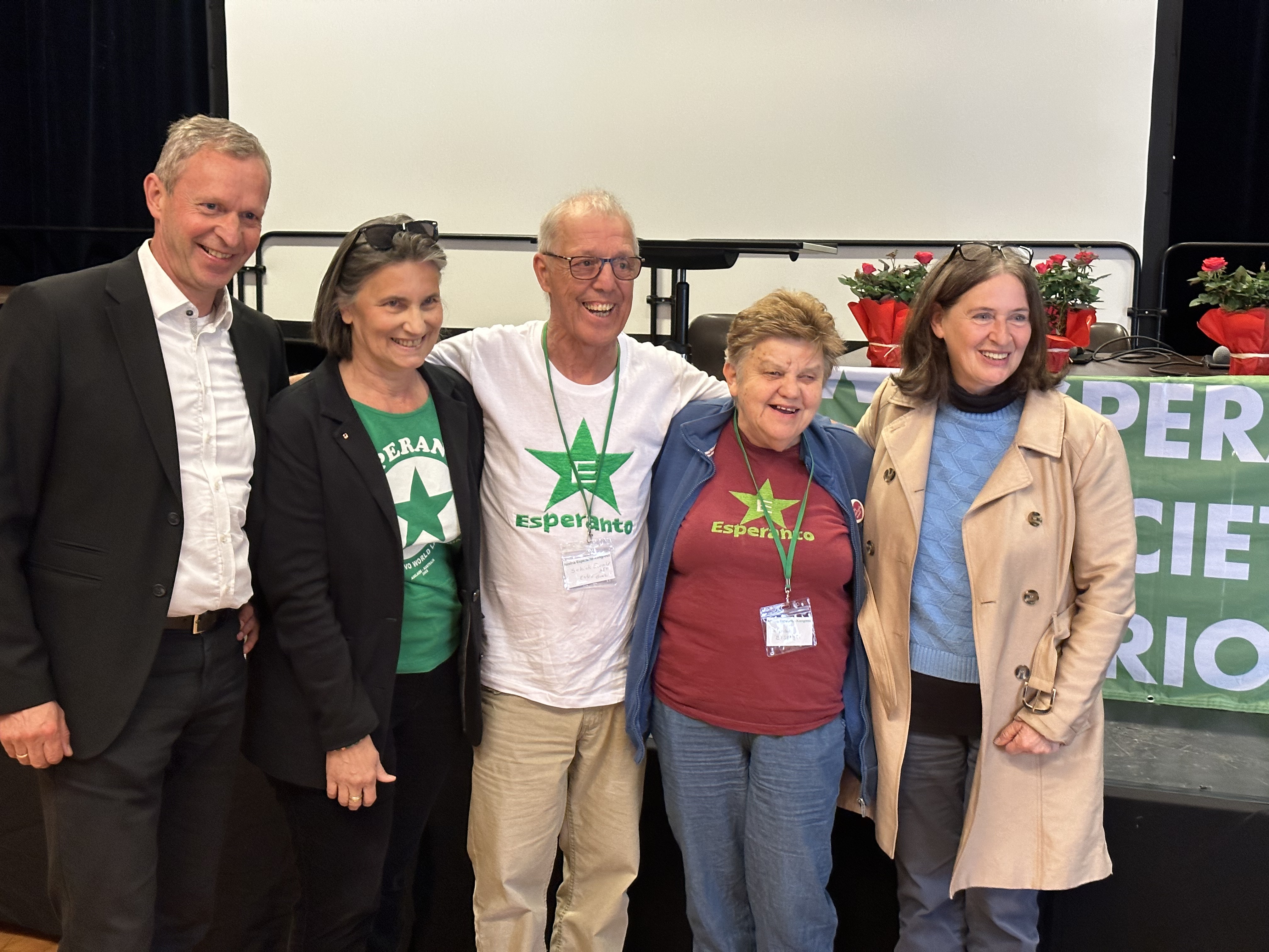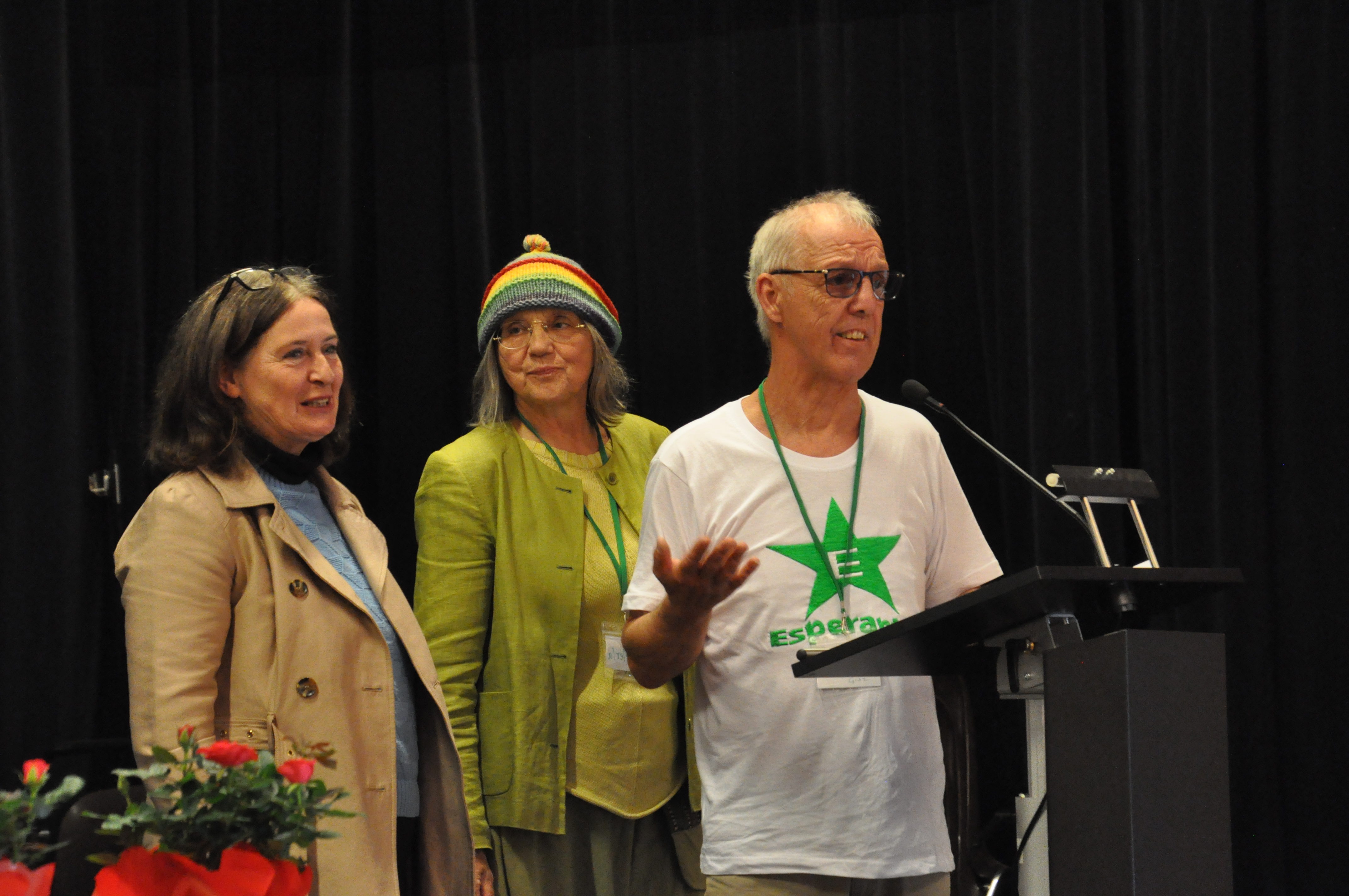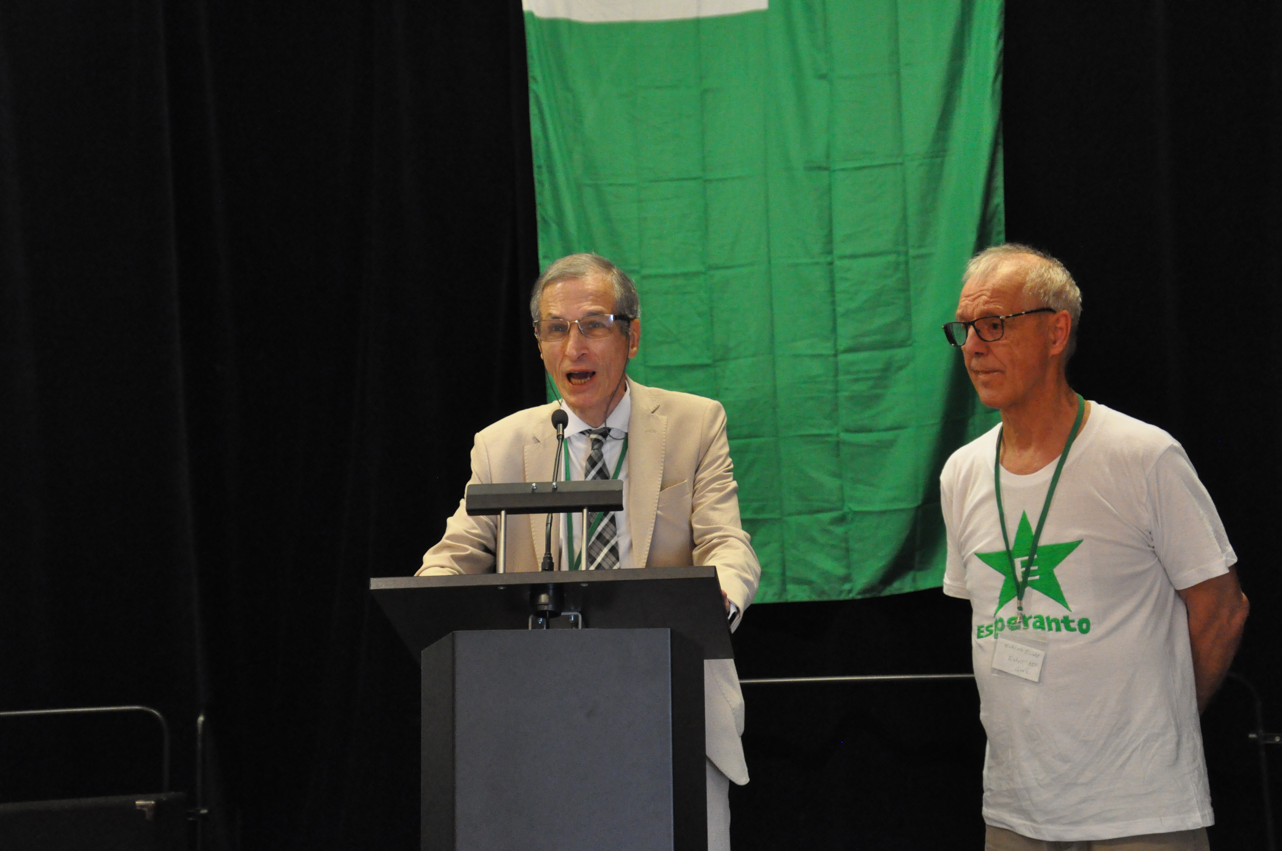 Die Grußworte jener Ehrengäste, die aus Termingründen an der Eröffnung nicht teilnehmen konnten, wurden in Deutsch und Esperanto verlesen. Die Grußworte vor Ort wurden von internationalen Kongressteilnehmern abschnittweise live auf Esperanto übersetzt. Eine besondere Herausforderung für seinen Übersetzer, den deutschen Esperantisten Martin Haase, der als Chefredakteur der deutschen Esperanto-Zeitung „Esperanto aktuell“, in der auch die Österreichische Esperanto-Bewegung regelmäßig mit zwei Seiten vertreten ist, „Kummer jeder Art“ gewöhnt ist, stellte der Grazer Tourismuschef Dieter Hardt-Stremayr dar, der mit seiner launigen Ansprache mit viel Esprit und Wortwitz veritable Fähigkeiten als Stand up Comedian unter Beweis stellte und die rund 45minütige Eröffnungsfeier akkurat zur Halbzeit mit viel Humor auflockerte. Überaus unterhaltsam schilderte er, wie Prezidanto Ewald Schick ihn von der Notwendigkeit überzeugt habe, den Grazer Stadtführer mit immerhin 44 Seiten Umfang neben 15 aufliegenden Sprachen auch auf Esperanto zu produzieren, bedankte sich gleichzeitig auch für die akkurate Übersetzung durch den führenden Grazer Eperantisten Dr. Klaus Perko. Einige hundert dieser Graz-Prospekte traten nun mit den Gästen ihren Heimweg in aller Herren Länder weltweit an. Die erste Auflage von 2.000 Exemplaren ist nahezu vergriffen, für die geplante, erweiterte Neuauflage wurde Dr. Perko bereits um Übersetzung der Ergänzungspassagen gebeten. Besonders erfreulich, dass auch zwei führende Mitglieder der Bahá’í-Gemeinde Graz die Kongress-Eröffnung persönlich beehrten. Besonders freut es die Veranstalter auch, dass Bgm. Elke Kahr sich beinahe für die gesamte Dauer der Eröffnungszeremonie Zeit nahm, und gerne bis zum Schluss geblieben wäre, hätte sie nicht dringend zu einer Veranstaltung mit Schülern auf den Schlossberg – Stichwort Europatag – gemusst.