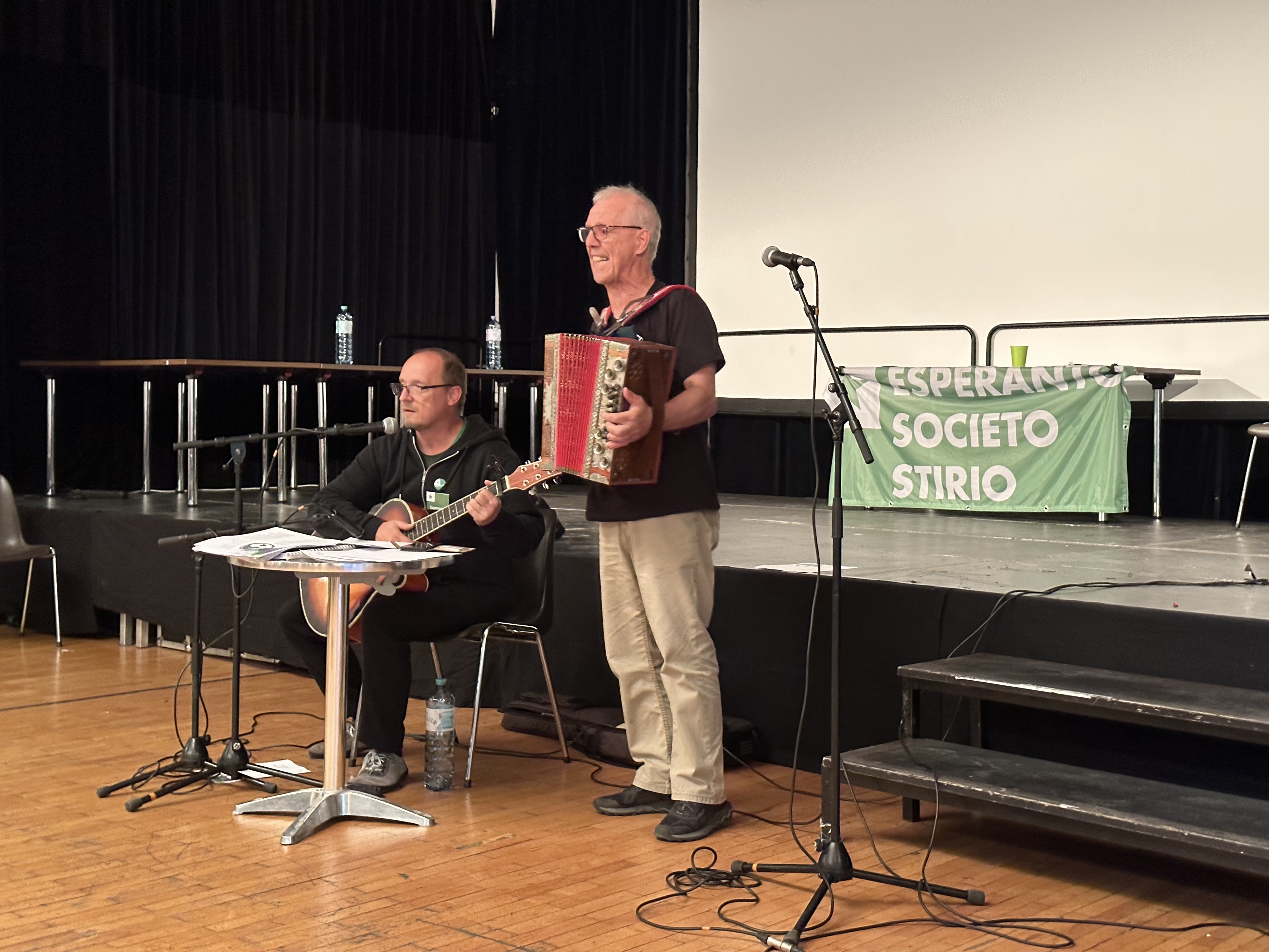 Zwei gesellige Abende mit Esperantoliedern, am Freitagabend mit der tschechischen Gruppe Safrda und am Samstagabend mit dem slowenischen Sänger Gregor Markovic, tatkräftig unterstützt von Gastgeber-Präsident Ewald Schick auf Harmonika, der seinen Gästen aus aller Welt damit auch steirisches Lokalkolorit mit auf den Heimweg gab, rundeten das intensive Vortragsprogramm ab und trugen mit dazu bei, dass die internationalen Gäste ihren Aufenthalt in Graz genossen und Kongress und Stadt in bester Erinnerung behalten werden.
